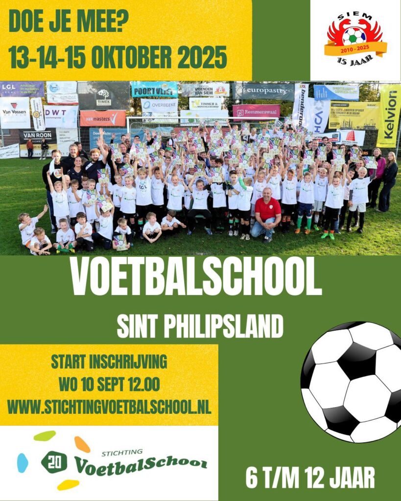 Nog ruim een maand wachten en dan is het zover! Dan vindt de 20e editie van de Voetbalschool in samenwerking met Vrienden van Siem in Sint Philipsland plaats. Volgende week woensdag 10 september om 12.00 uur opent de link om je in te schrijven. De link is te vinden op Facebook en op onze website www.stichtingvoetbalschool.nl